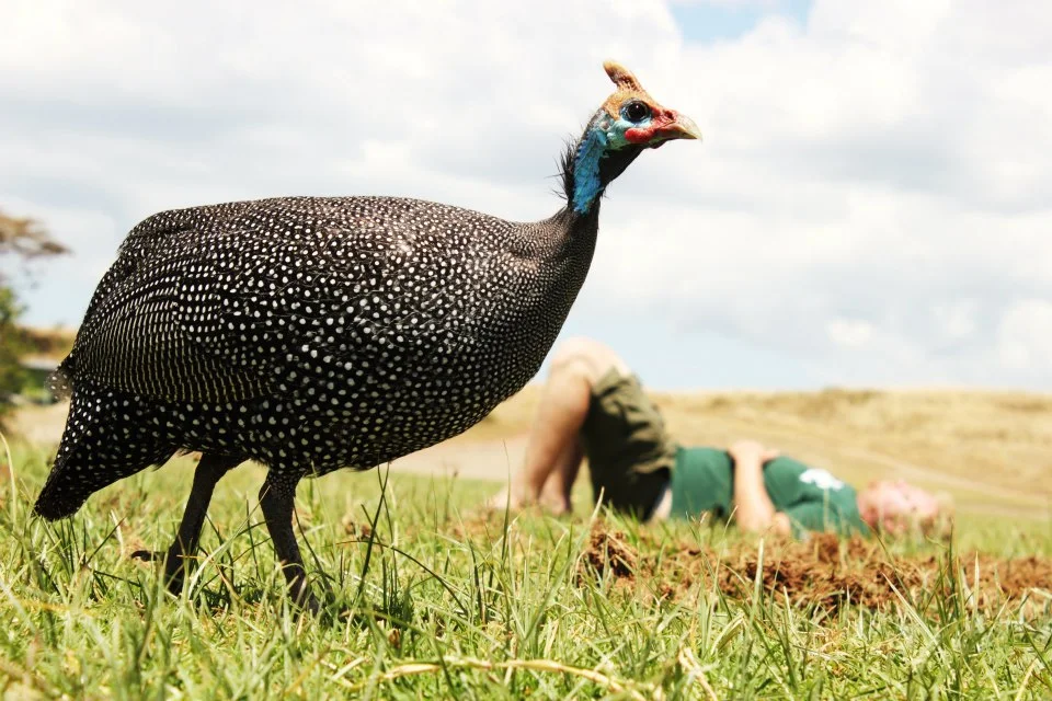 Relaxing in the Serengeti with a helmeted guineafowl